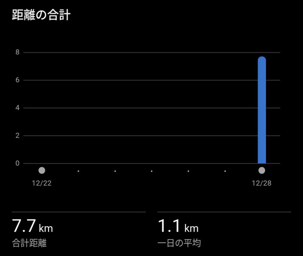 今週は1回のランニングで7.7kmの走行のみとなりました。