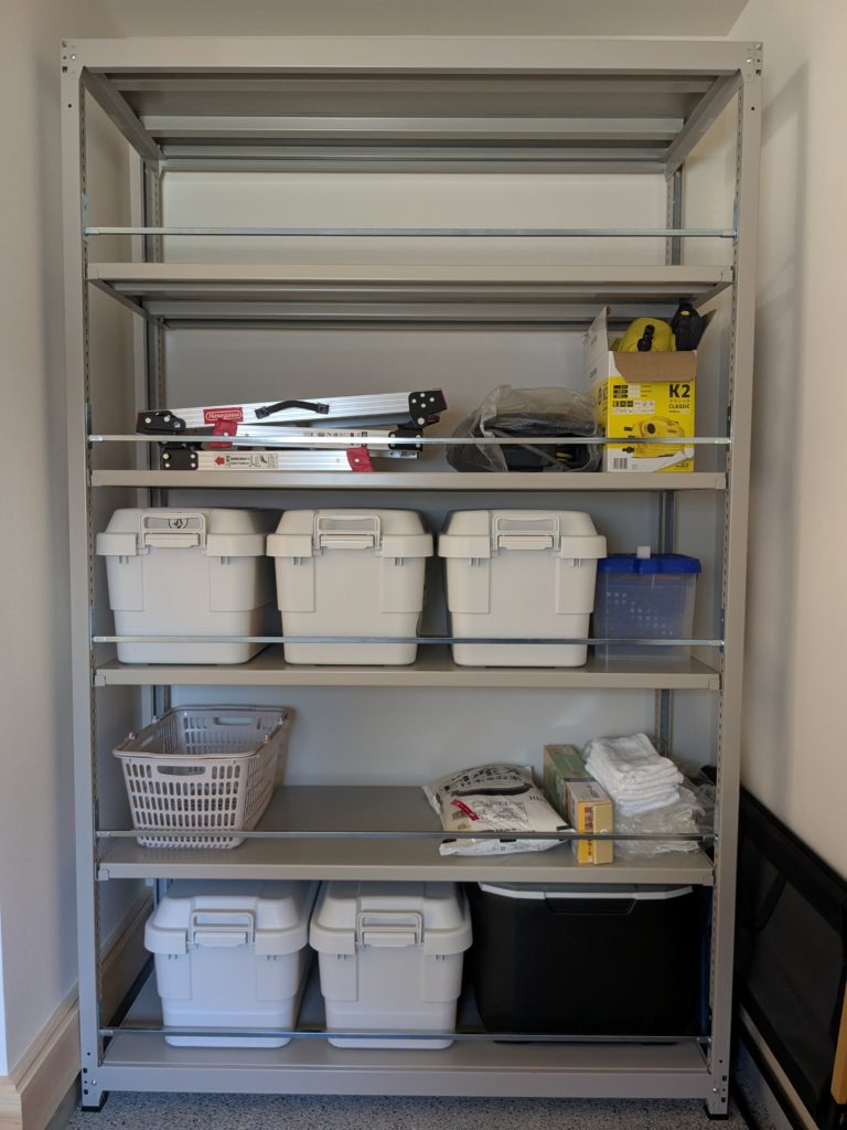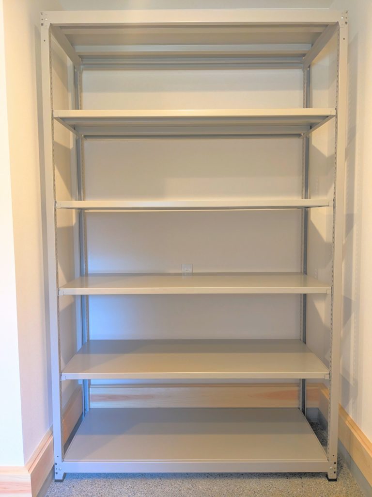 わが家は、幅150×奥行60×高さ240cmのまあまあ大きめなサイズを選択、棚板は4枚、また耐荷重も棚板1枚あたり150kgに耐えられる商品を選びました
